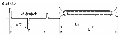 電纜故障測試系統測量電纜故障時,電纜可視為一條均勻分布的傳輸線,在電纜一端加脈沖電壓,則此脈沖按一定的速度(決定于電纜介質電常數和導磁系數)沿線傳輸,當脈沖遇到故障點(或阻抗不均勻點)就會發生反射,用閃測儀記錄下發送脈沖和反射脈沖之間的傳輸時間△T,則可按已知的傳輸速度V來計算出故障的距離Lx,Lx=V·△T/2,如圖10所示。